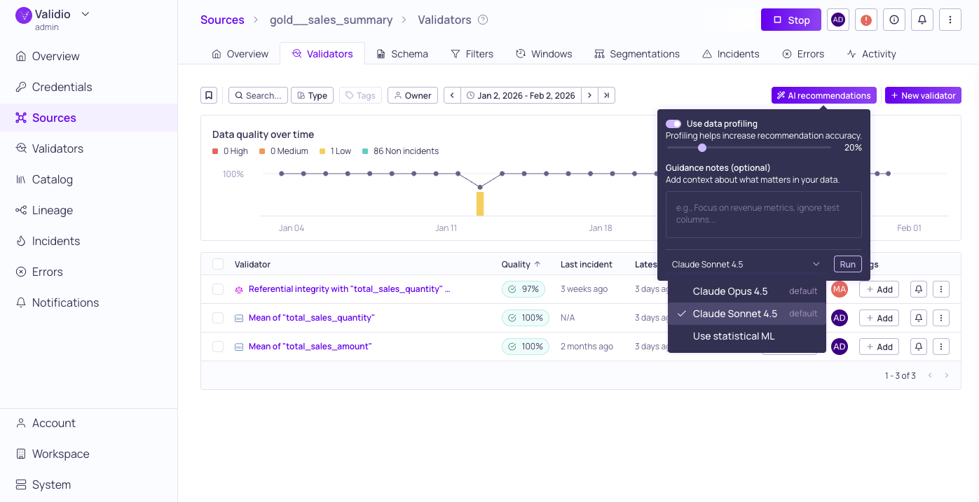 - Get validator recommendations: Leverage LLM-powered data profiling to suggest pre-configured validators for your sources