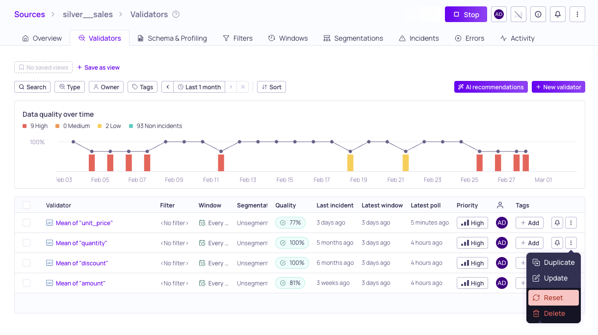 You can now reset individual validators without affecting the rest of your source data. Resetting a validator deletes all existing metric data, incidents, and artifacts from the selected validators and places them into a pending backfill mode. This granular approach allows you to trigger targeted backfills and update thresholds without the risk of disrupting your existing integrations.