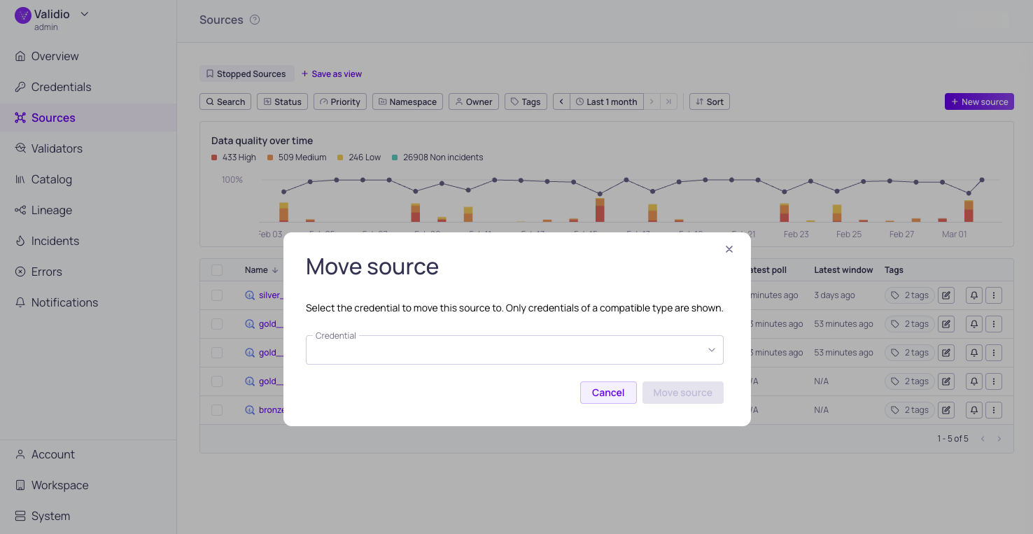 This release introduces more flexibility to how you organize and maintain your data environment within Validio. You can now move sources between credentials (and namespaces) and reset validators without the need for manual re-configuration, ensuring that your monitoring remains stable while your enterprise architecture evolves.