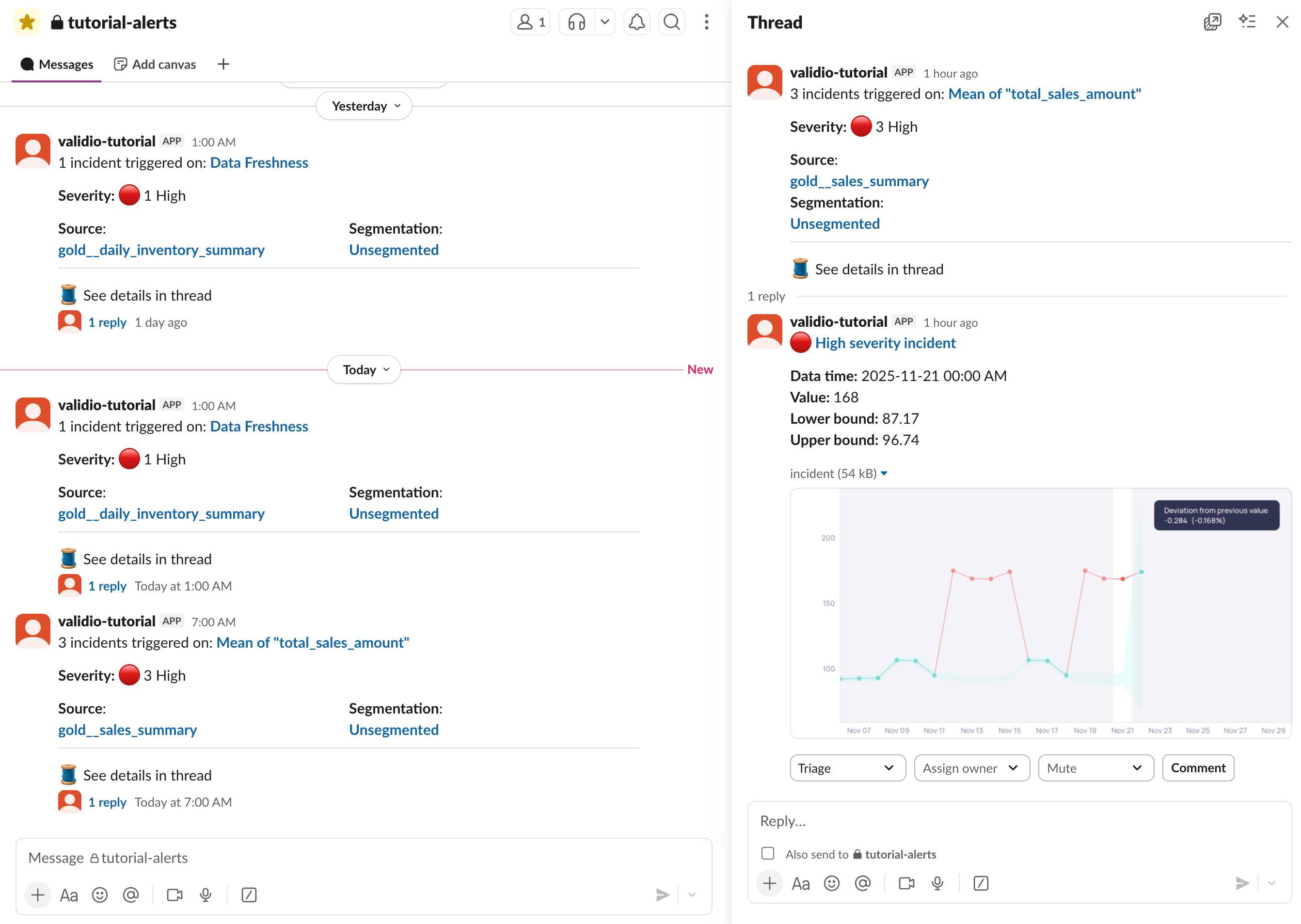 - Follow up with your investigation within Validio. See Triaging Critical Alerts.