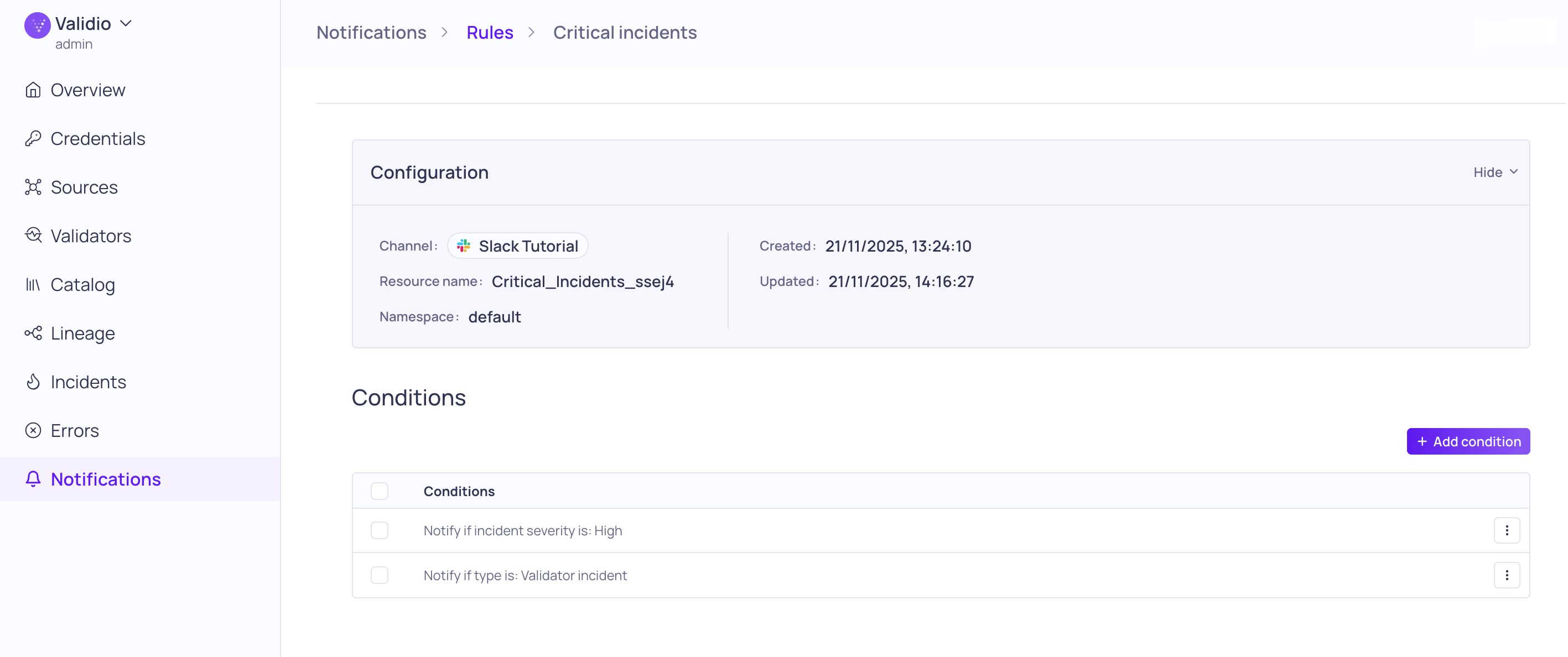 If you are already using Slack for team collaboration, routing Validio alerts to a Slack channel provides seamless integration with your existing workflow. In this tutorial, you will set up alerting for critical incidents to a Slack channel.