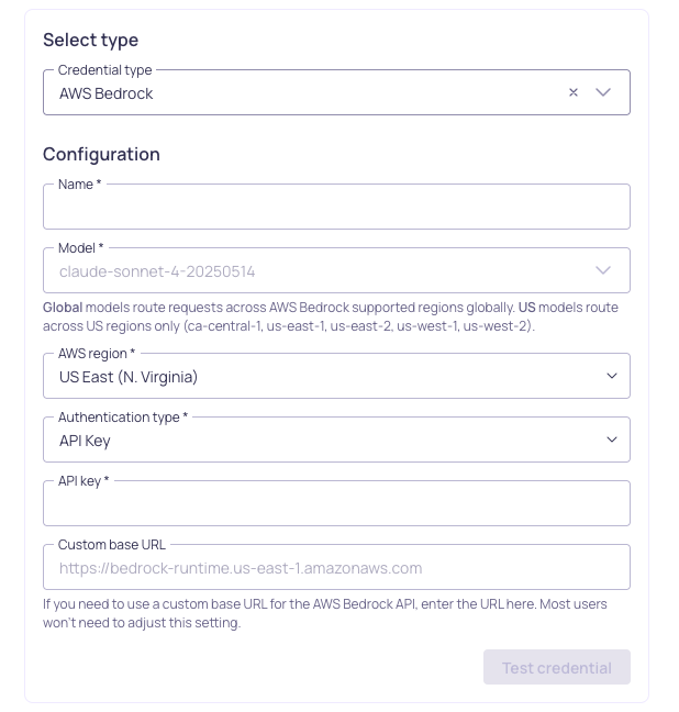 Parameter Description Name A unique identifier for this credential. Model Select language model from the list, or enter a custom model ID or inference profile ARN. Models prefixed with Global route requests across all AWS Bedrock supported regions, while US models route only to North American regions (ca-central-1, us-east-1, us-east-2, us-west-1, us-west-2). AWS region Select your valid AWS region. Authentication type Select how to authenticate your identity when making requests to the Amazon Bedrock API. API key Enter a valid Amazon Bedrock API key. Custom base URL (Optional) Custom base URL for the Amazon Bedrock API. Only needed if using a proxy or custom endpoint.