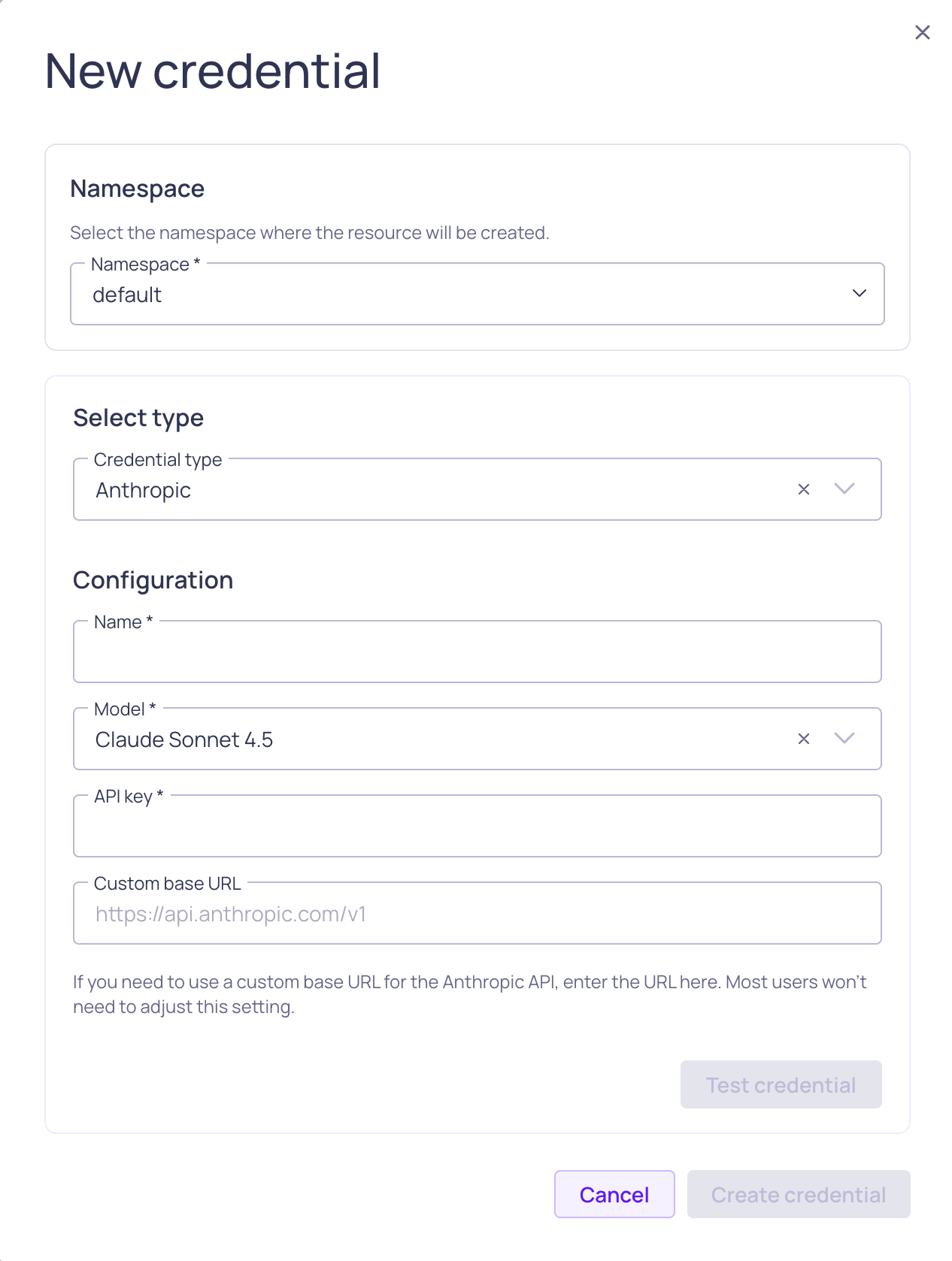 Parameter Description Name A unique identifier for this credential. Model Select from available Anthropic models (Claude 4, Claude Sonnet 4.5) or, if the desired model is not in the list, enter the Claude API IDof the model. Refer to Models overview in Claude documentation.API key Your Anthropic API key from the Anthropic Console. The valid API key starts with sk-ant-api03-Custom base URL (Optional) Custom base URL for the Anthropic API. Only needed if using a proxy or custom endpoint.