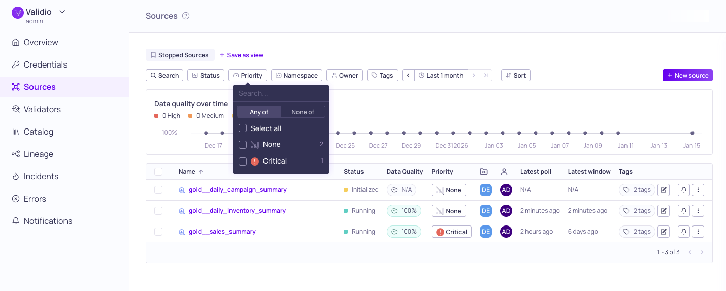 Across many Validio pages--including Sources, Validators, and Incidents--you'll find a consistent layout featuring resource tables with detailed columns. When managing very high volumes of data, you can use search and filter tools to isolate the specific resources you need.