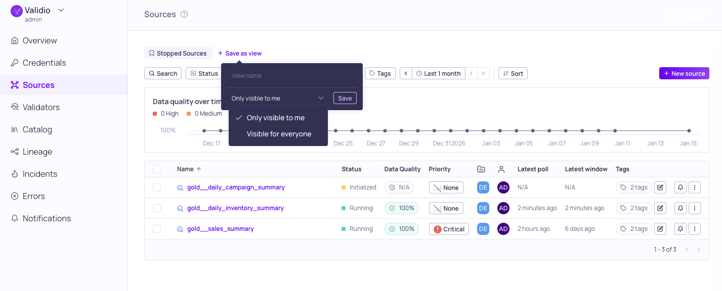 Saved Searches are now Saved Views Starting with Validio 7.4, "Saved Searches" have been renamed to Saved Views. We are currently rolling out an updated UI to support this change. You may notice a different interface on the Sources page compared to other pages as we finalize the transition across the platform. For saving searches on other pages, such as Validators and Incidents, see Saving Searches.