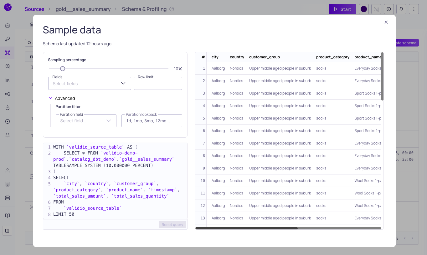 | Partition field | (Advanced) Select a partition field to filter the data before sampling. This limits the sample to specific partitions rather than scanning the full dataset. |