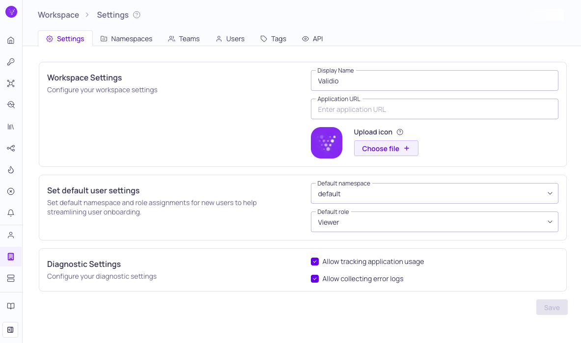 The Workspace > Settings tab is where administrators manage system-wide (global) configurations, such as custom application settings and default user settings, for your Validio environment.
