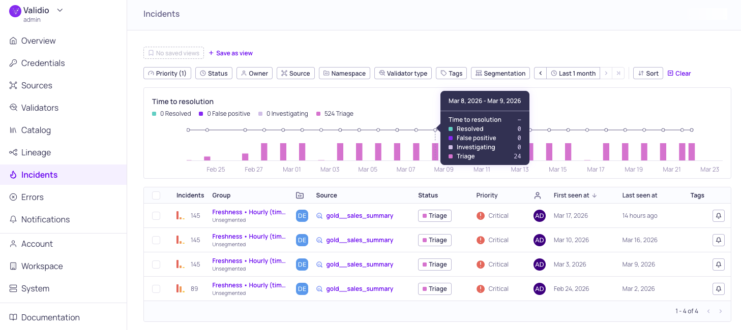 An incident is a data quality issue captured by a Validator. Incidents can have a severity of Low, Medium, or High.