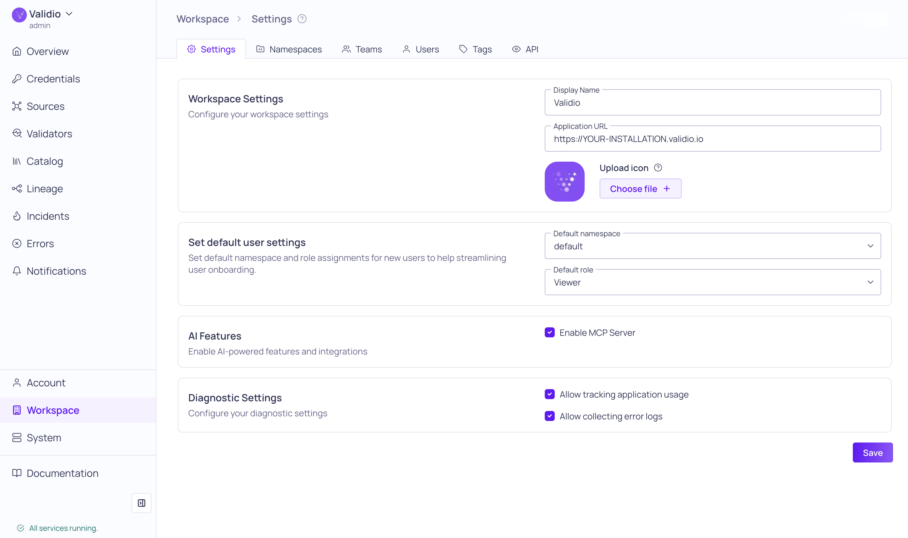https://YOUR-INSTALLATION.validio.io. - Under AI Features, check Enable MCP Server.