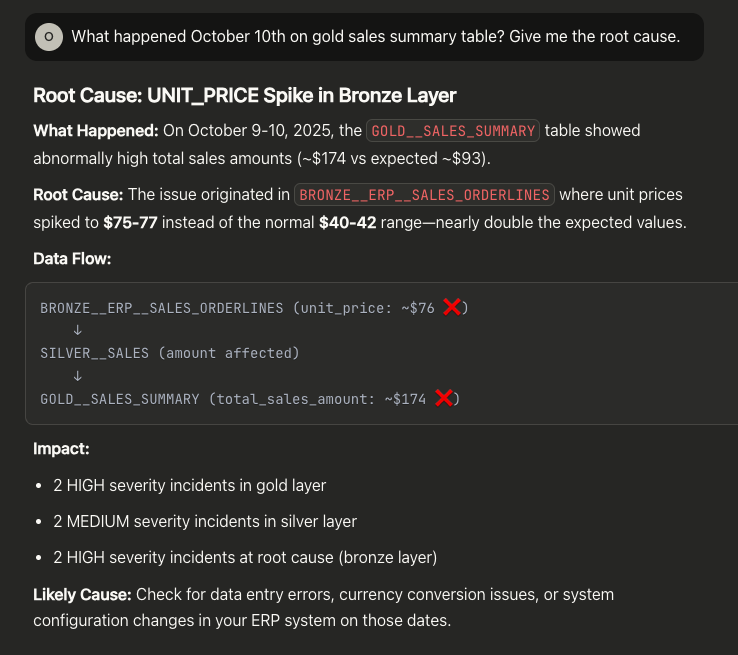 You: "What's causing the most recent incidents in my customer_orders table?"