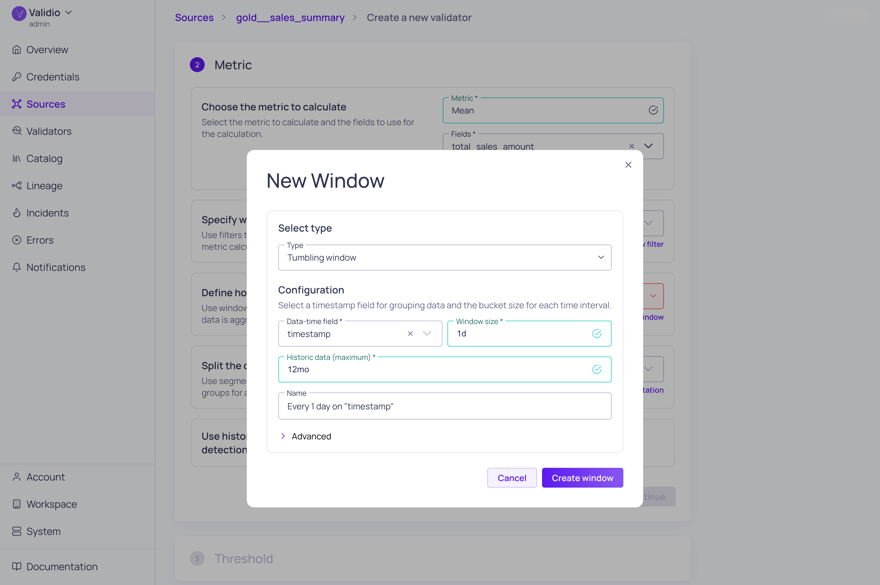 Because gold__sales_summary is a data warehouse source with time-series data, we recommend using a tumbling window to group the data for validation. Global windows, which are automatically created when you add a source, are better suited for dimensional tables. For more information about configuring windows, see About Windows in our product documentation.