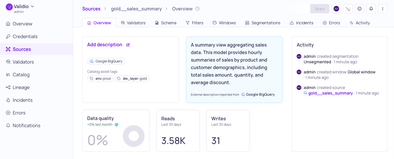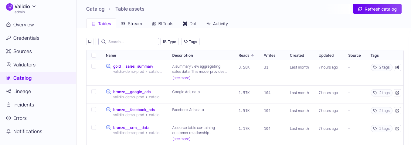 Although you can view Catalog information about the assets discovered on the credential, Validio does not read data or poll for updates from the assets. To start monitoring data, you need to add a data source, which you can quickly do by converting a catalog asset into a source.