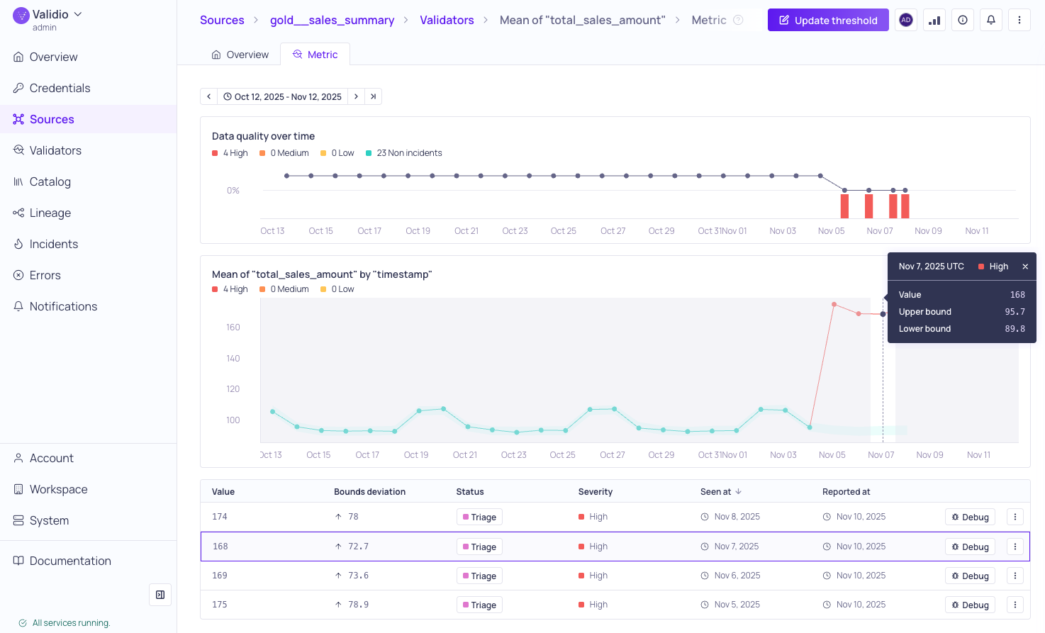 On the Validators tab, select the validator you created, for example: Mean of "total_sales_amount", to open its details page. On the Metrics tab, you can review the validator's calculated Data Quality over time, the daily values of the calculated metric, and the detected incidents.