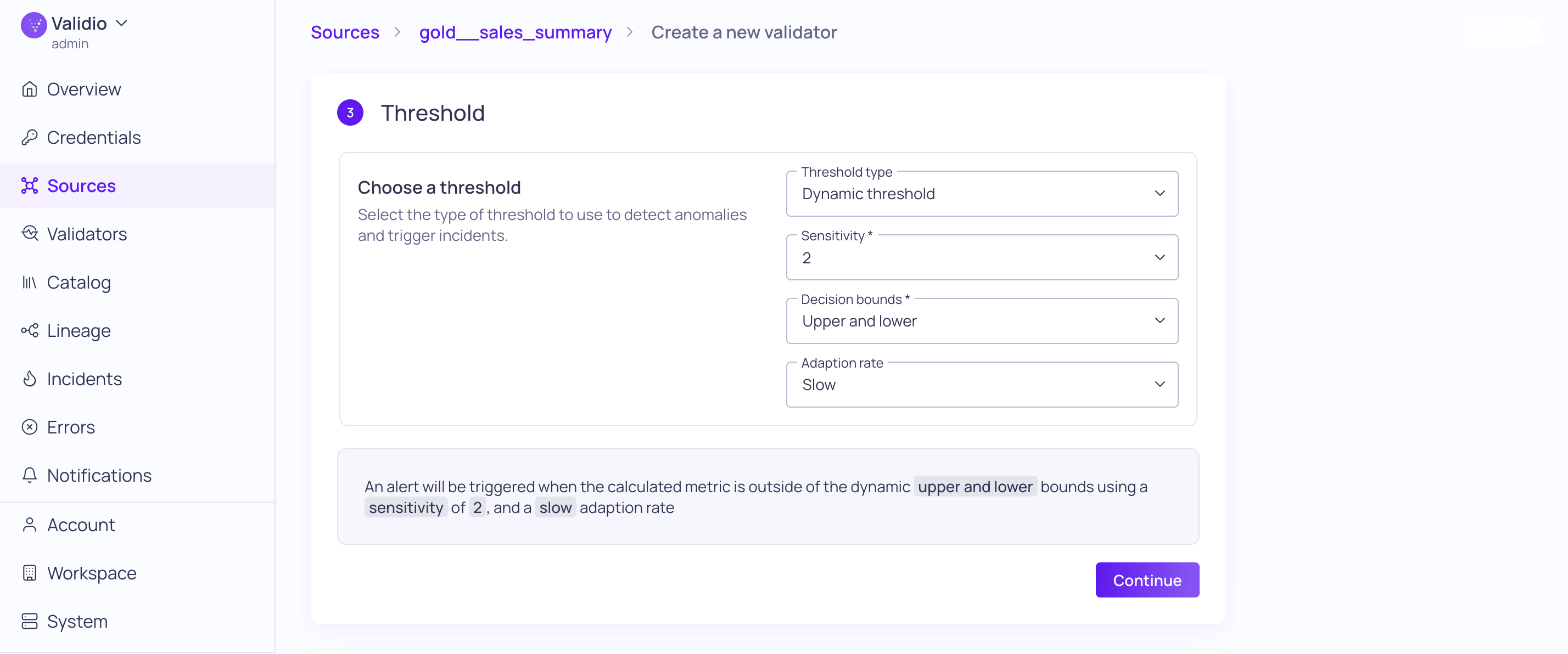 - Click Continue to create the Mean of "total sales amount" validator.
