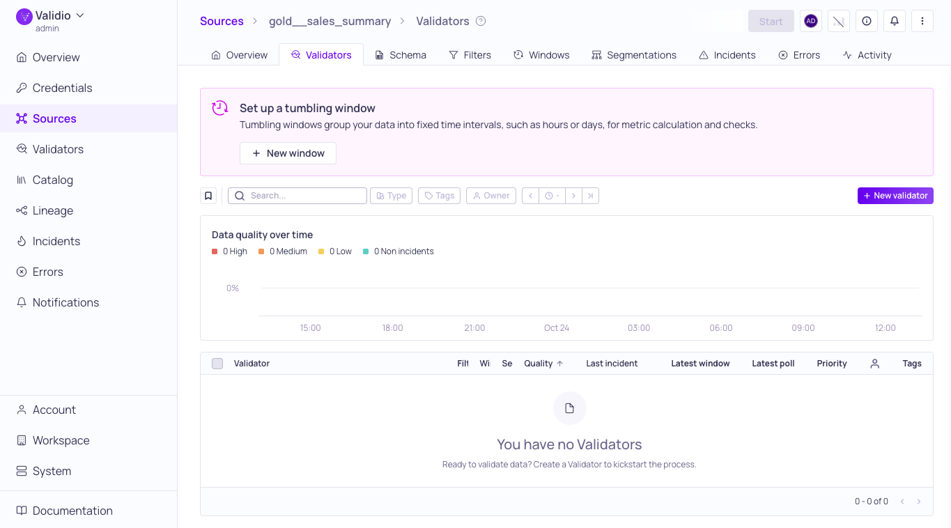 - Navigate to Sources > gold__sales_summary and click + New validator.