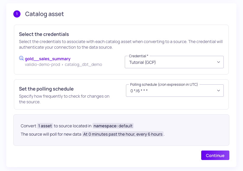- Credential - Select the tutorial credential you created to associate with the asset when converting to a source.