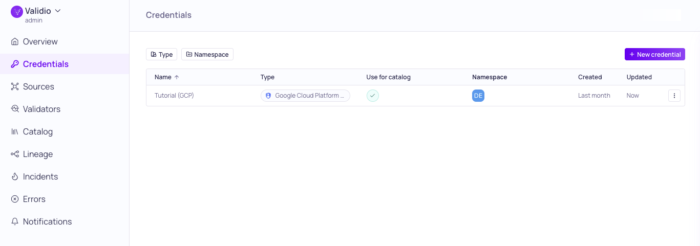 The first step to monitoring is adding a credential to connect Validio to the source.