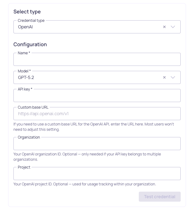 Parameter Description Name A unique identifier for this credential. Model Select from available OpenAI models (such as GPT-5, GPT-4.1) or, if the desired model is not in the list, enter the model ID. Refer to Models overview in OpenAI documentation. API key Your OpenAI API key from the OpenAI Platform. The valid API key starts with sk-Custom base URL (Optional) Custom base URL for the OpenAI API. Only needed if using a proxy or custom endpoint. Organization (Optional) Your OpenAI organization ID. Only needed if your API key belongs to multiple organizations. Project (Optional) Your OpenAI project ID, used for usage tracking within your organization.
