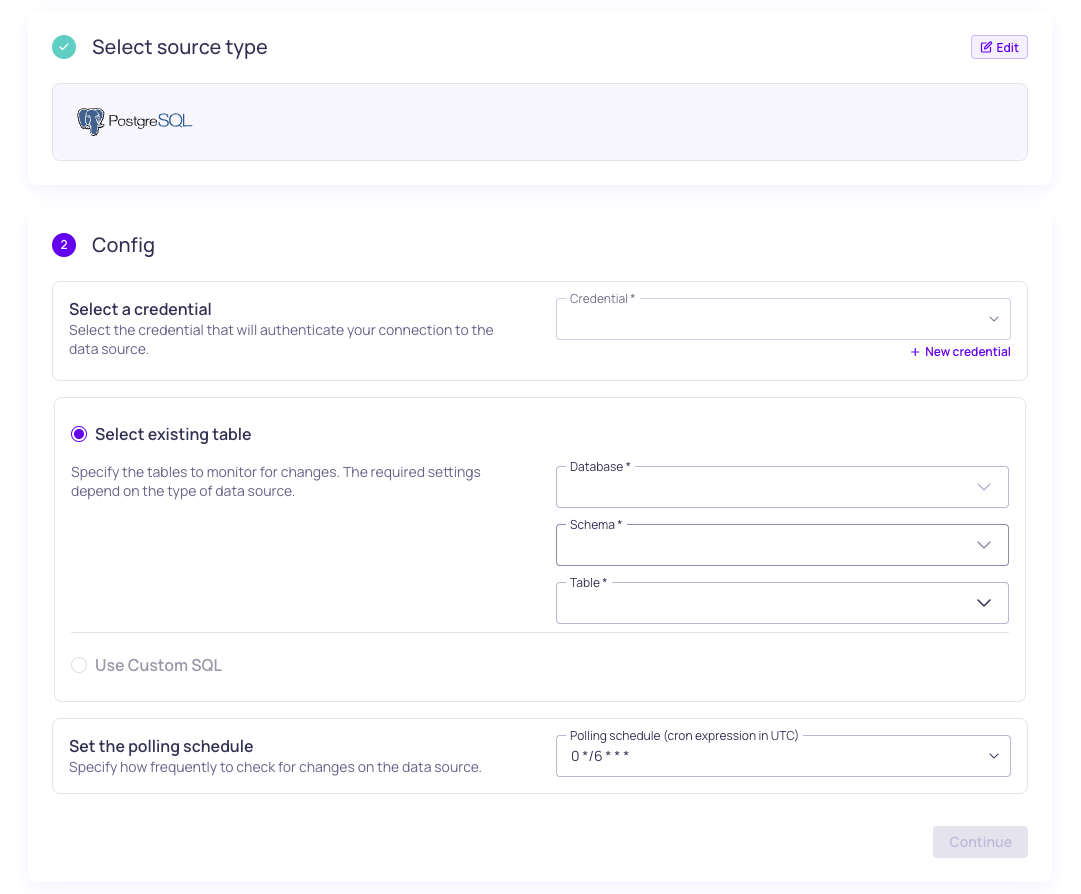 - Select an existing table -- Enter the Database, Schema, and Table to specify where the data comes from. Selecting more than one table will create a new source for each table. Refer to the Source Configuration Parameters table.