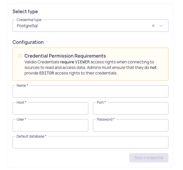 - Create a Validio credential to connect to the service account. See Add a PostgreSQL Credential.