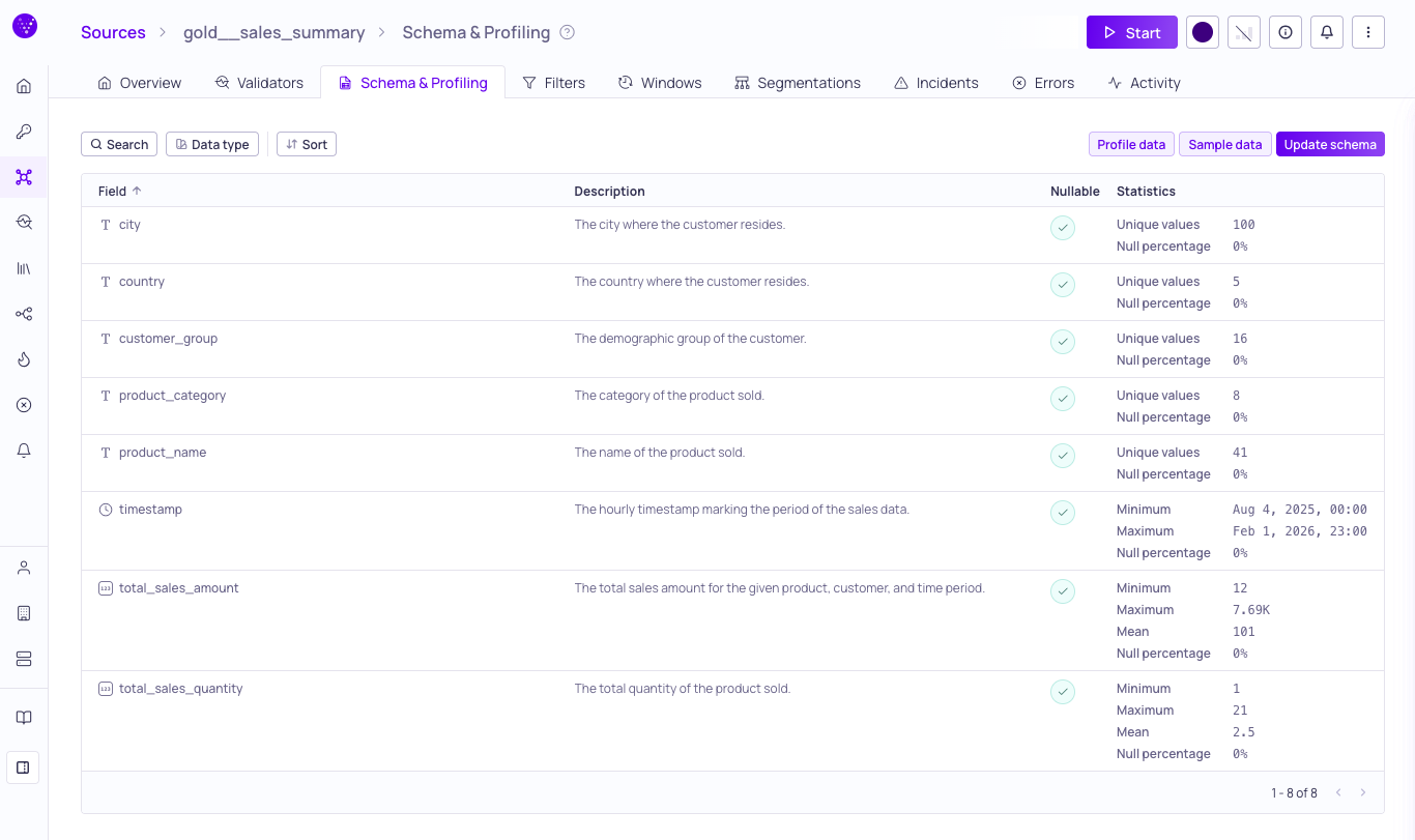 Validio automatically derives a schema for every source using two primary methods: metadata reading and schema inference. This ensures you data validation rules are built on accurate schema information without manual setup.