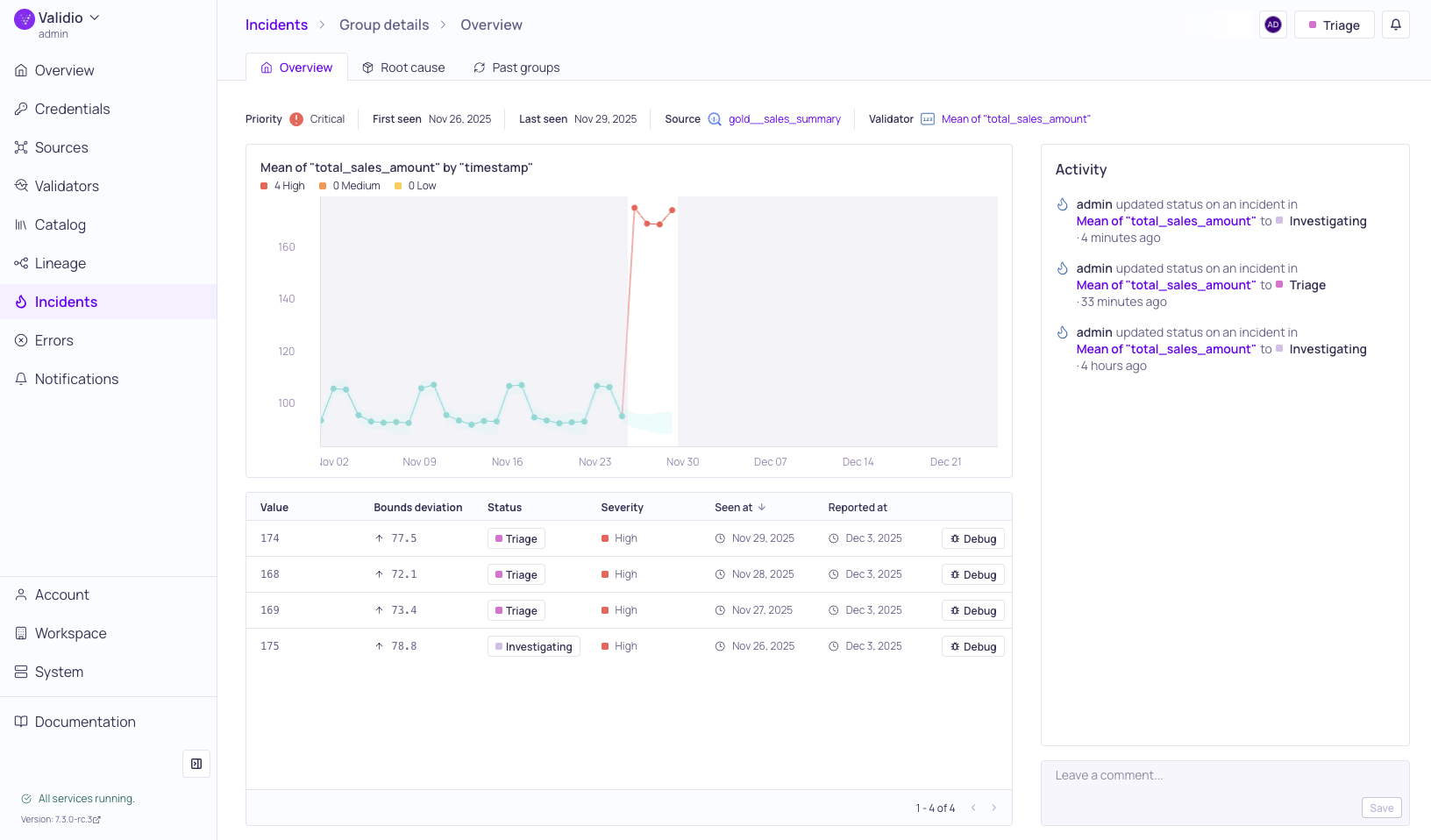The incident group details page provides an overview of all the incidents and their status. The page also includes an Activity log where you can record your findings with Comments, and the Root Cause Analysis tab where you can review Validio's analysis of the incident group.