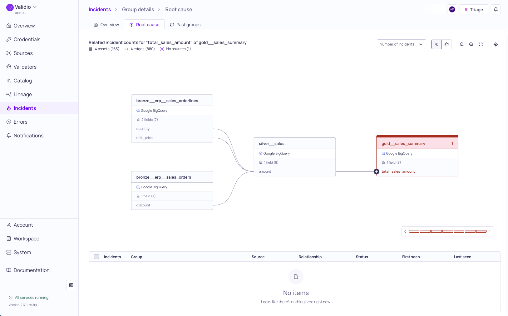 Validio Root Cause Analysis (RCA) automatically identifies relationships between incidents to help you understand the underlying causes and downstream impacts.