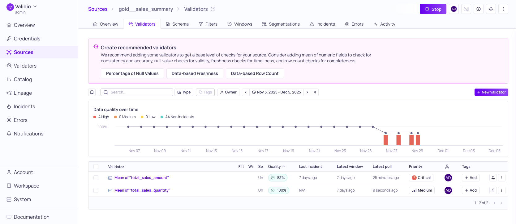 An incident is a data quality issue detected by a Validator when data deviates from configured thresholds. Incidents represent potential problems that require investigation and resolution to maintain data reliability. Each incident has a severity level and a priority to help you triage and determine which to address first.