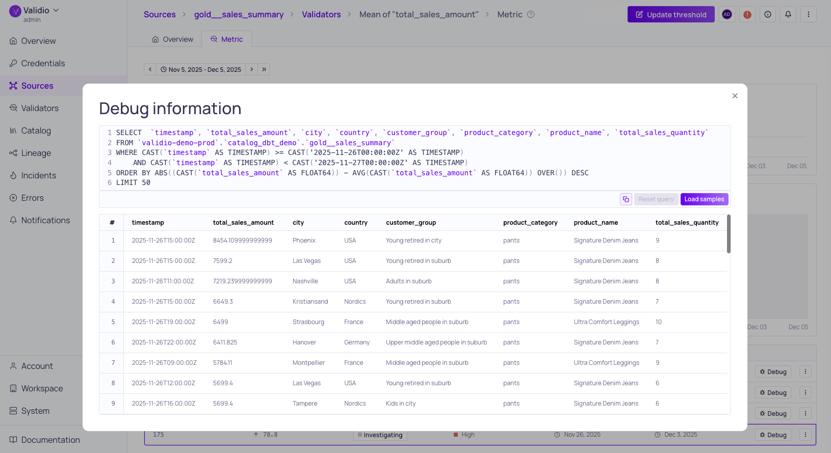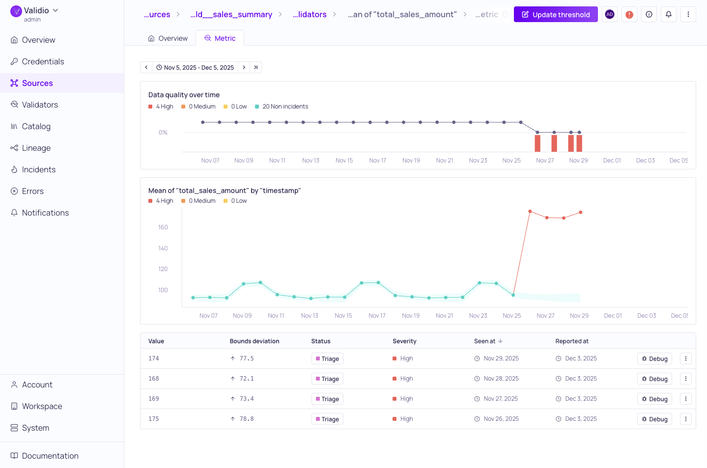 Navigate to details page for the validator (Mean of “total_sales_amount”). The validator details page lists all the incidents discovered by this validator. To help you understand the scope and scale of the problem, the table includes actual values and deviations that triggered each incident on the validator.