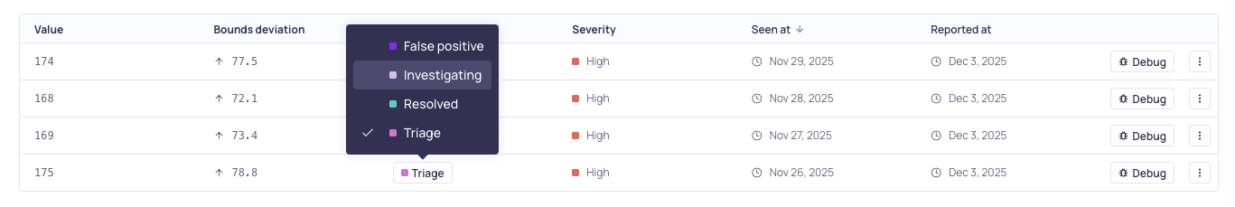Properly updating the incident statuses is important for improving Validio's anomaly detention algorithms. For example, marking false positives retrains the model, reducing noise and improving accuracy over time. For more information, see Model Feedback and Retraining and Managing Incidents.
