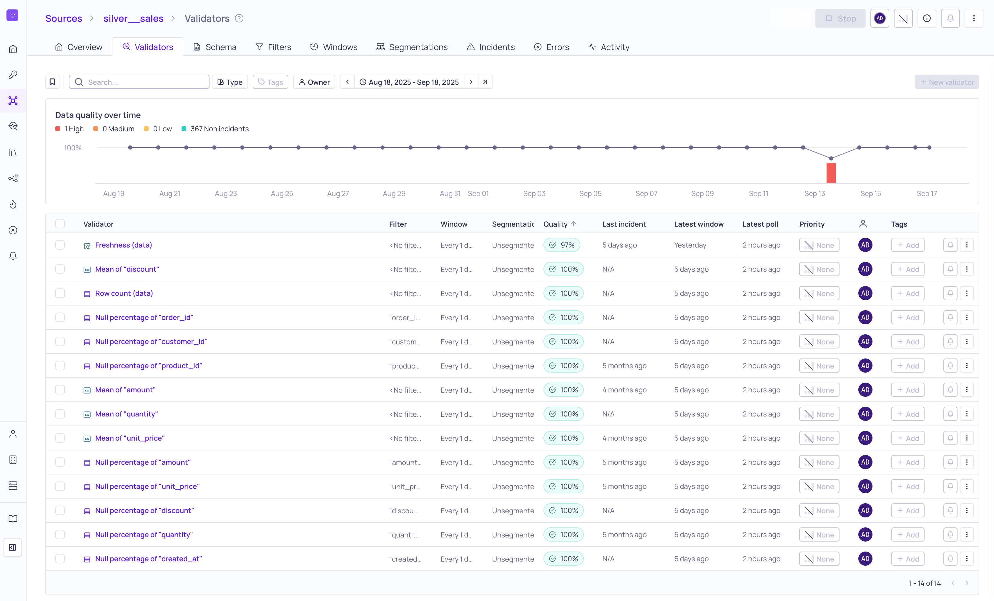 You can review and manage validators on the global Validators page, the Validators tab on the Source details page, or the individual Validator details page.