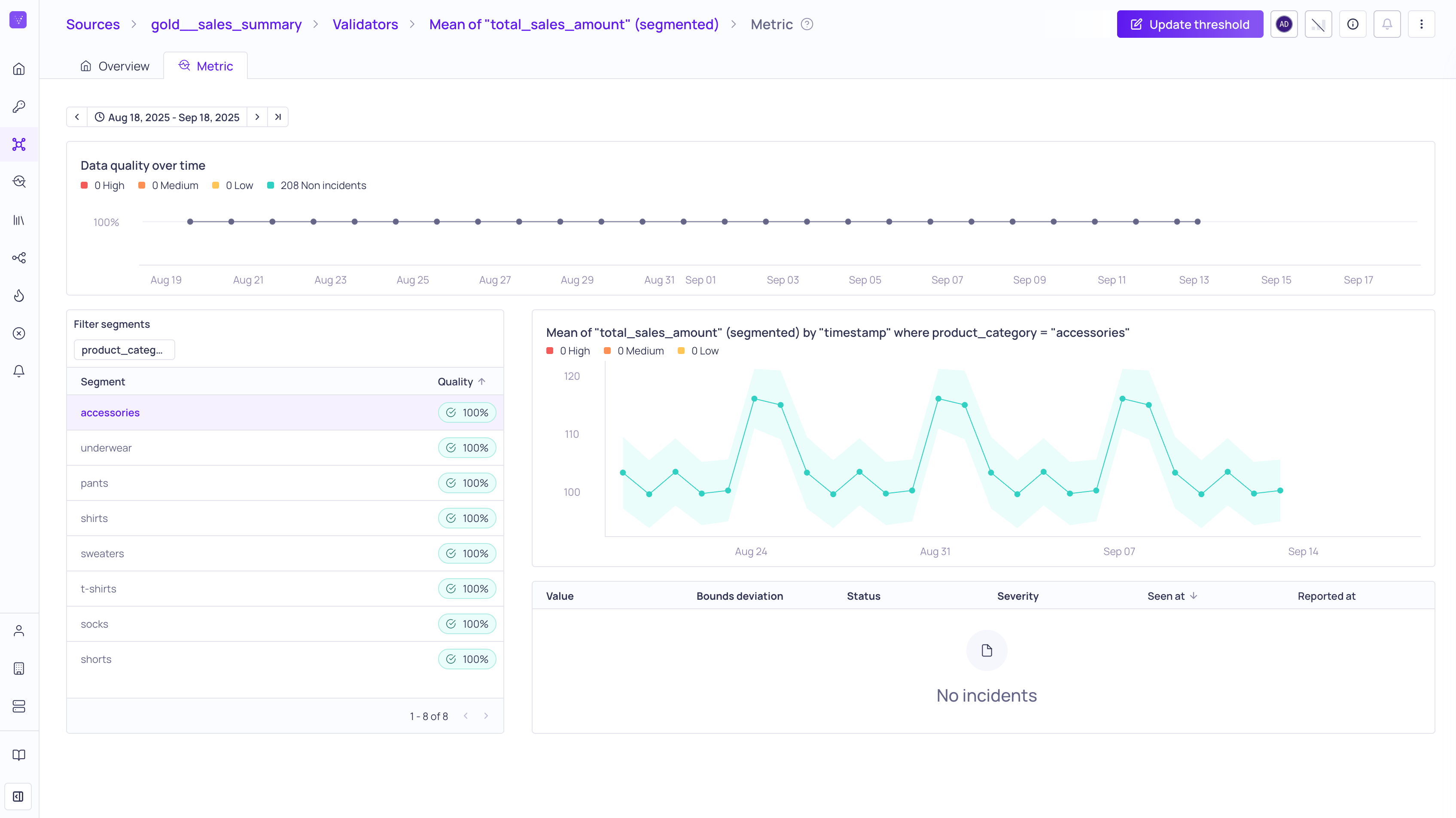 The Metrics tab displays information about the data quality and incidents that were detected by this validator. This page includes the Data Quality over time graph, the incident metrics graph, a list of detected incidents, and segment filters if you have segmentation configured on the validator.