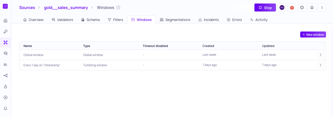 A window defines the batch size of the dataset to use for calculating and validating metrics on your source. For example, to validate an aggregate calculation (such as mean, max, or min) you must define a window to specify how much and which datapoints to include. You can then select the configured window when you create new validators or segmentations on the source.
