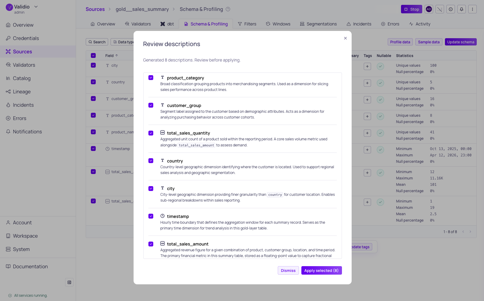 - Use the checkboxes to select which descriptions to keep. Each item shows the field name, data type, and a preview of the generated description.