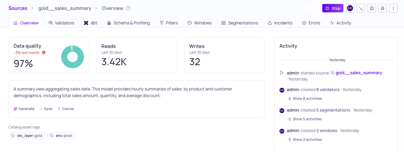 Validio can use AI to generate rich, contextual descriptions for entities across the platform. The AI analyzes available metadata — schema information, glossary terms, tags, lineage context, and existing descriptions — to produce descriptions tailored to each entity type.