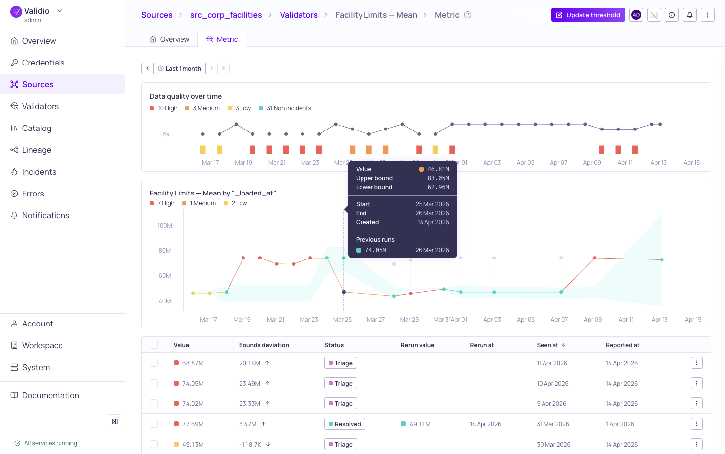 Rerunning a validator re-executes the validation on the most recent window (or a specific window when triggered from the metric graph) while preserving all existing metric data, incidents, and audit history. This is a non-destructive action designed for verifying data fixes after remediation, particularly in regulated industries where a complete audit trail is required.