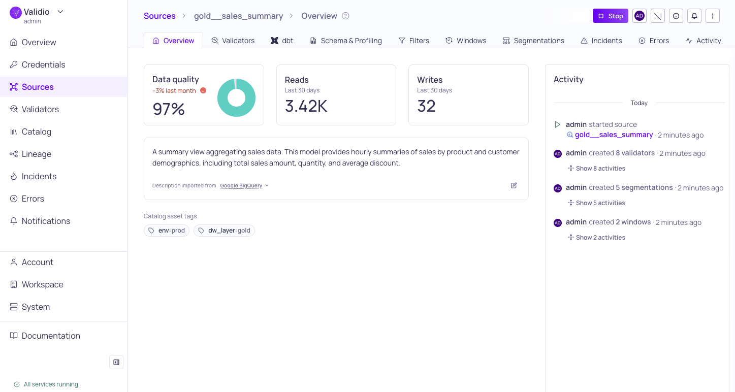 | Description | You can add a description to the source in Validio. Also automatically imports descriptions from external sources, such as Snowflake or dbt. |