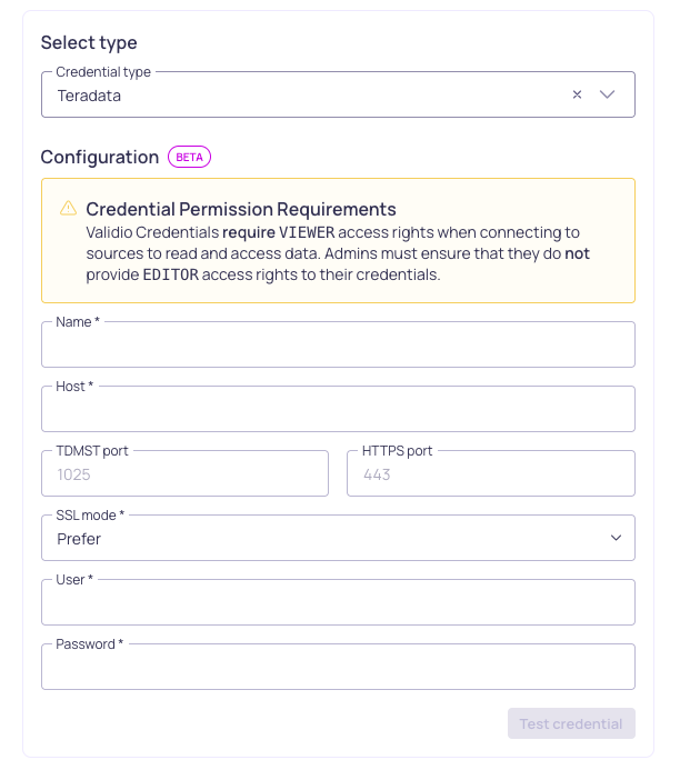 - (Optional) Click Test credential to validate that Validio can successfully access the Teradata account. If validation fails, check that you provided the correct parameter values.